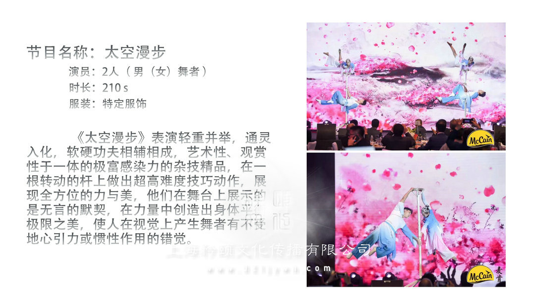 《大空漫步》表演輕重并舉,通靈入化,軟硬功夫相輔相成,藝術性、觀掌性于一體的極富感染力的雜技精品,上海雜技團演員在一根轉動的桿上做出超高唯度技巧動作,展現全方位的力與美,他們在舞臺上展示的是無言的默契,在力量中創(chuàng)造出身體平衡極限之美,使人在視覺上產生舞者有不受地心引力或慣性作用的錯覺。