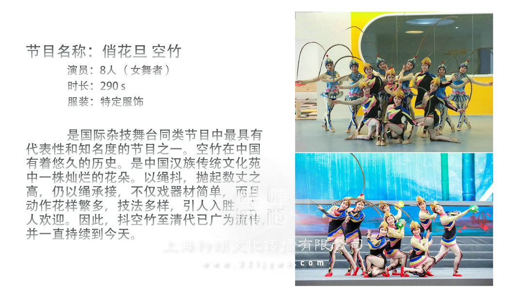 節(jié)目名稱:俏花旦抖空竹是國際雜技舞臺同類節(jié)目中最具有代表性和知名度的節(jié)目之一??罩裨谥袊兄鴤骶玫臍v史。是中國漢族傳統(tǒng)文化茹中一株燦爛的萑朵。以繩抖,拋起數丈之高,仍以繩承接,不僅戲器材簡單,而且動作萑樣繁多,技法多樣,引人入勝,人歡迎。因此,抖空竹至清代已廣為流傳,并一直持續(xù)到今天。