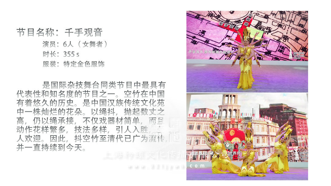 千手觀音是國際雜技舞臺同類節(jié)目中最具有代表性和知名度的節(jié)目之一??罩裨谥袊兄鴤骶玫臍v史。是中國漢族傳統(tǒng)文化茹中一株燦爛的萑朵。以繩抖,拋起數丈之高,仍以繩承接,不僅戲器材簡單,而且動作萑樣繁多,技法多樣,引人入勝,人歡迎。因此,抖空竹至清代已廣為流傳,并一直持續(xù)到今天。