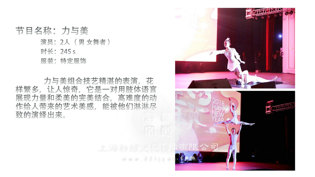 力與美組合技藝精湛的表演,花樣繁多,讓人驚奇,它是一對用肢體語言展現力量和柔美的完美結合高唯度的動作給人帶來的藝術美感,能被他們淋淋盡致的演繹出來。