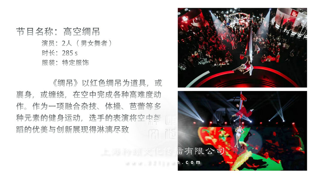 《綢吊》以紅色綢吊為道具,或裹身,或纏繞,在空中完成各種高唯度動作。作為一項融合雜技、體操、芭蕾等多種元素的健身運動,上海雜技團的選手表演將空中舞蹈的優(yōu)美與創(chuàng)新展現得淋漓盡致。