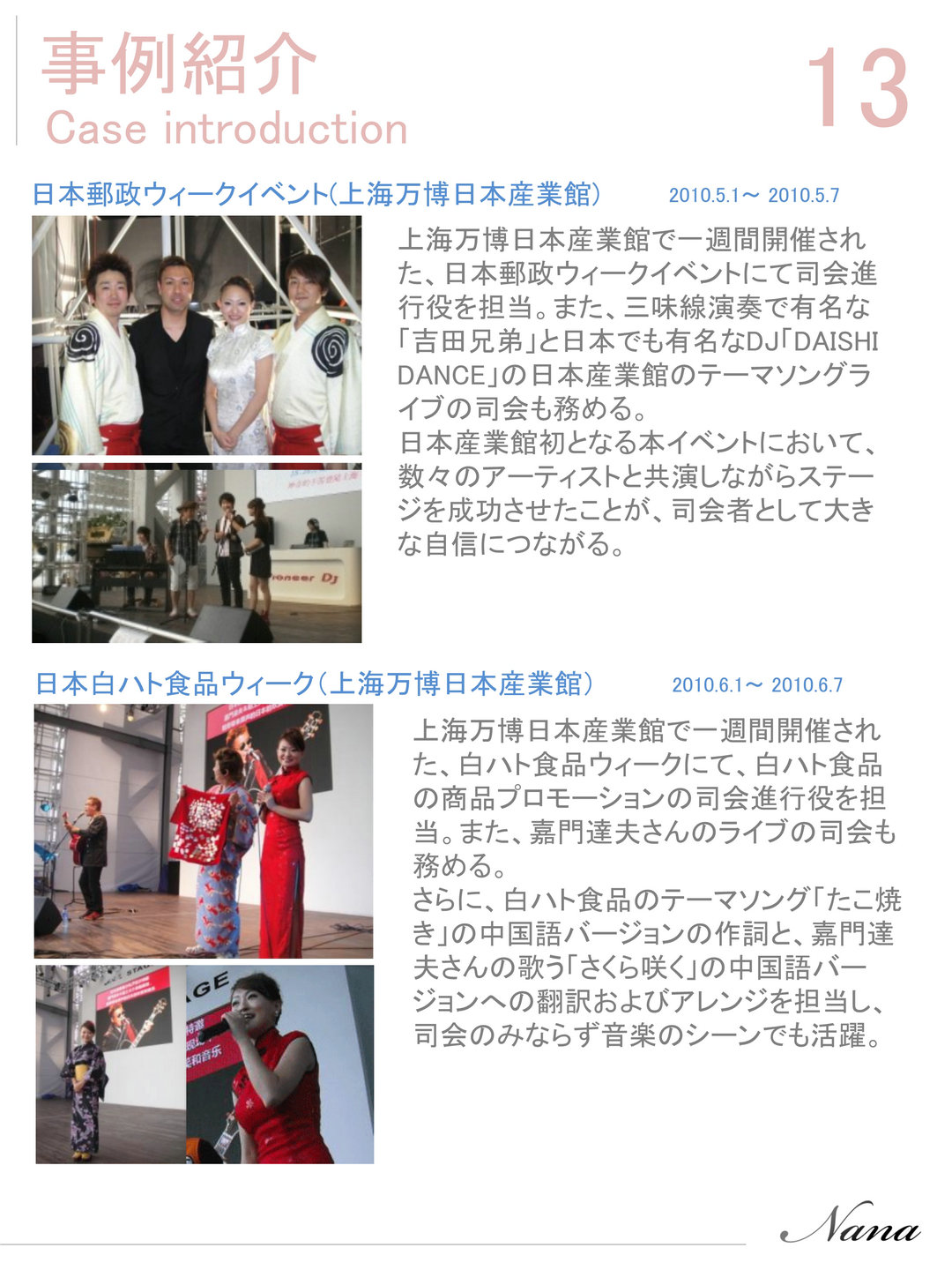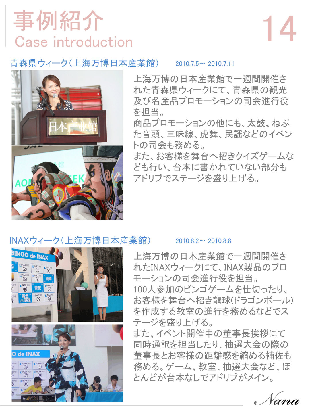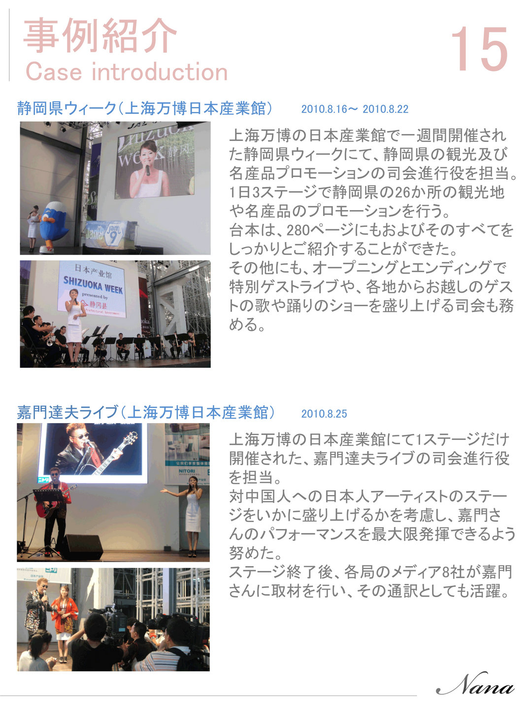 上海萬(wàn)博日本産業(yè)館で一週間開(kāi)催された、日本郵政ウィークイベントにて司會(huì)進(jìn)行役を擔(dān)當(dāng)。また、三味線(xiàn)演奏で有名な「吉田兄弟」と日本でも有名なDJ「DAISHI DANCE」の日本産業(yè)館のテーマソングライブの司會(huì)も務(wù)める。